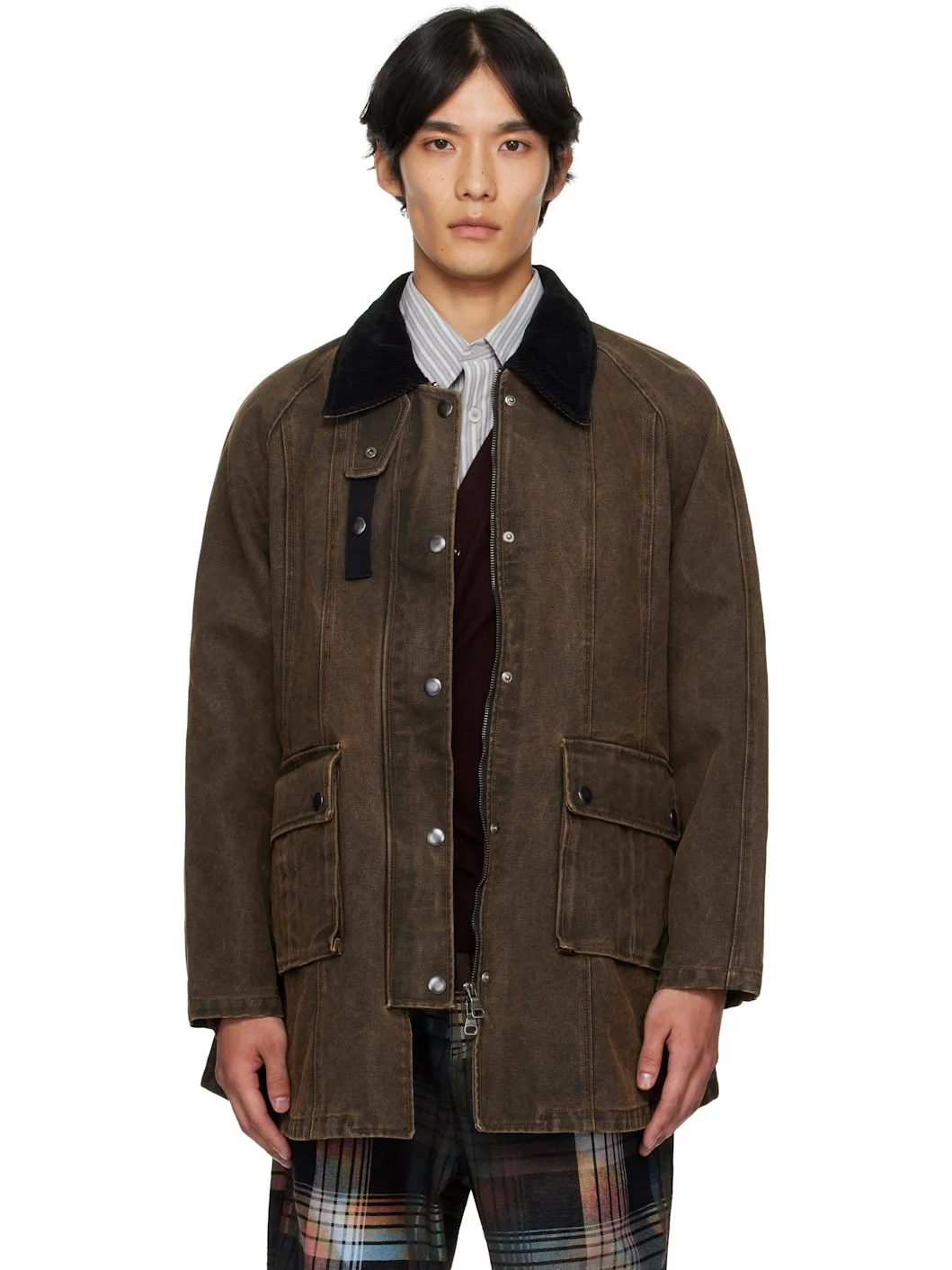 Heavyweight cotton canvas jacket. · Fading throughout · Corduroy spread collar · Press-stud tab at collar · Two-way zip closure with press-stud placket · Webbing applique at chest and back collar · Flap pockets at waist · Storm flap at back yoke · Unlined Supplier color: Brown 100% cotton. Made in South Korea 252375M180004