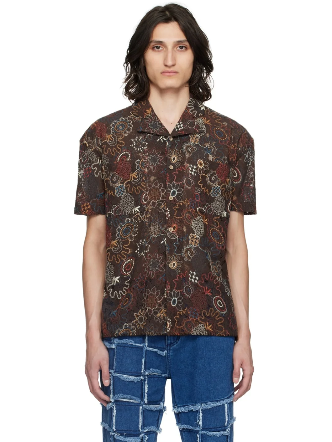 Semi-sheer cotton-blend lace shirt. Floral pattern embroidered throughout. · Open spread collar · Button closure · Patch pocket at chest · Tennis-tail hem · Box pleat at back yoke Supplier color: Brown 78% cotton, 22% nylon. Made in South Korea 241375M192003