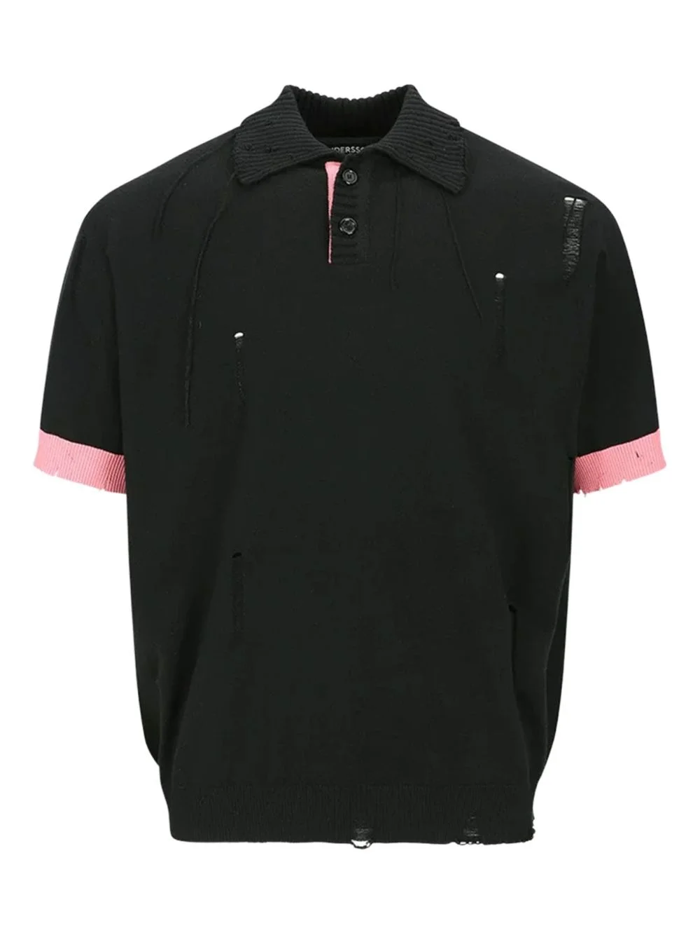 Damaged short-sleeve polo shirt Highlights - Black - Pink trim - Short sleeves - Ribbed collar - Distressed detailing - Short front button fastening Imported Composition Acrylic 41%, Polyester 36%, Cotton 23% Washing instructions Read Manufacturer Guidelines