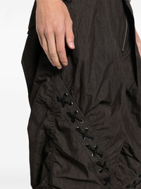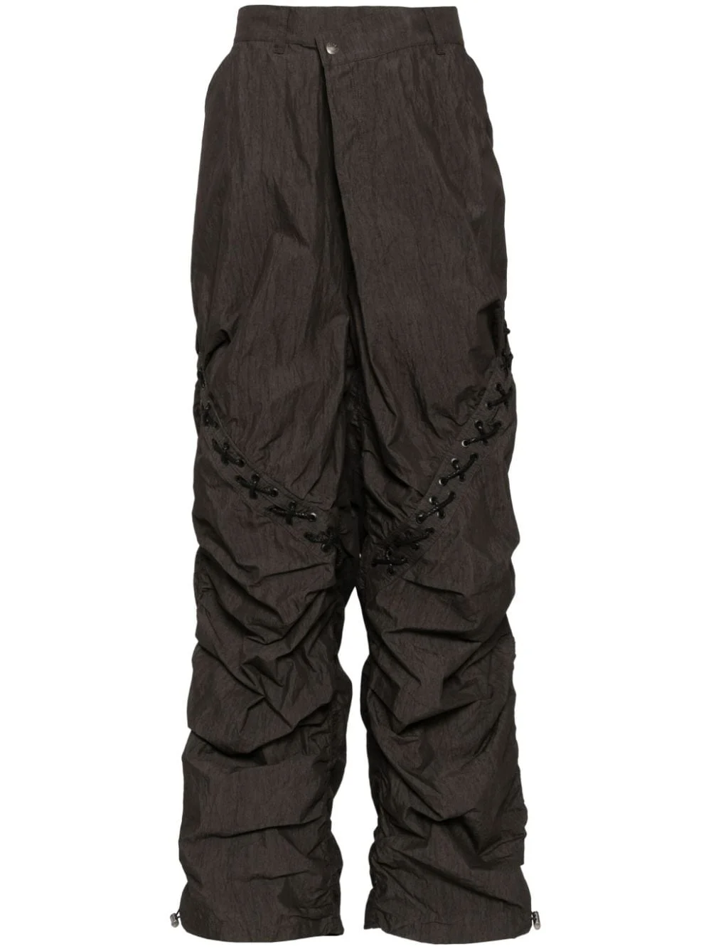 Dua trousers Highlights - Charcoal black - Cotton blend - Gathered detailing - Belt loops - Asymmetric front button fastening - Concealed front zip fastening - Two side slash pockets - Lace-up detailing - Two rear flap pockets - Drawstring hem Imported Composition Cotton 60%, Nylon 40% SIZE & FIT Model measurements Height 6 ft 2 in(1.89 m) Bust/Chest 35.03 in(89 cm) Hips 34.64 in(88 cm) Waist 28.34 in(72 cm) FittingInformation Designed for a relaxed tapered leg, allowing a comfortable loose fit above the knee with a closer fit towards the calves The internal drawstring at the hem allows for fitted preferences at the ankle Made from a midweight non-stretch fabric This piece fits true to size – take your usual size