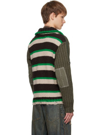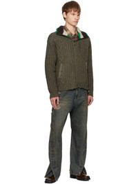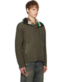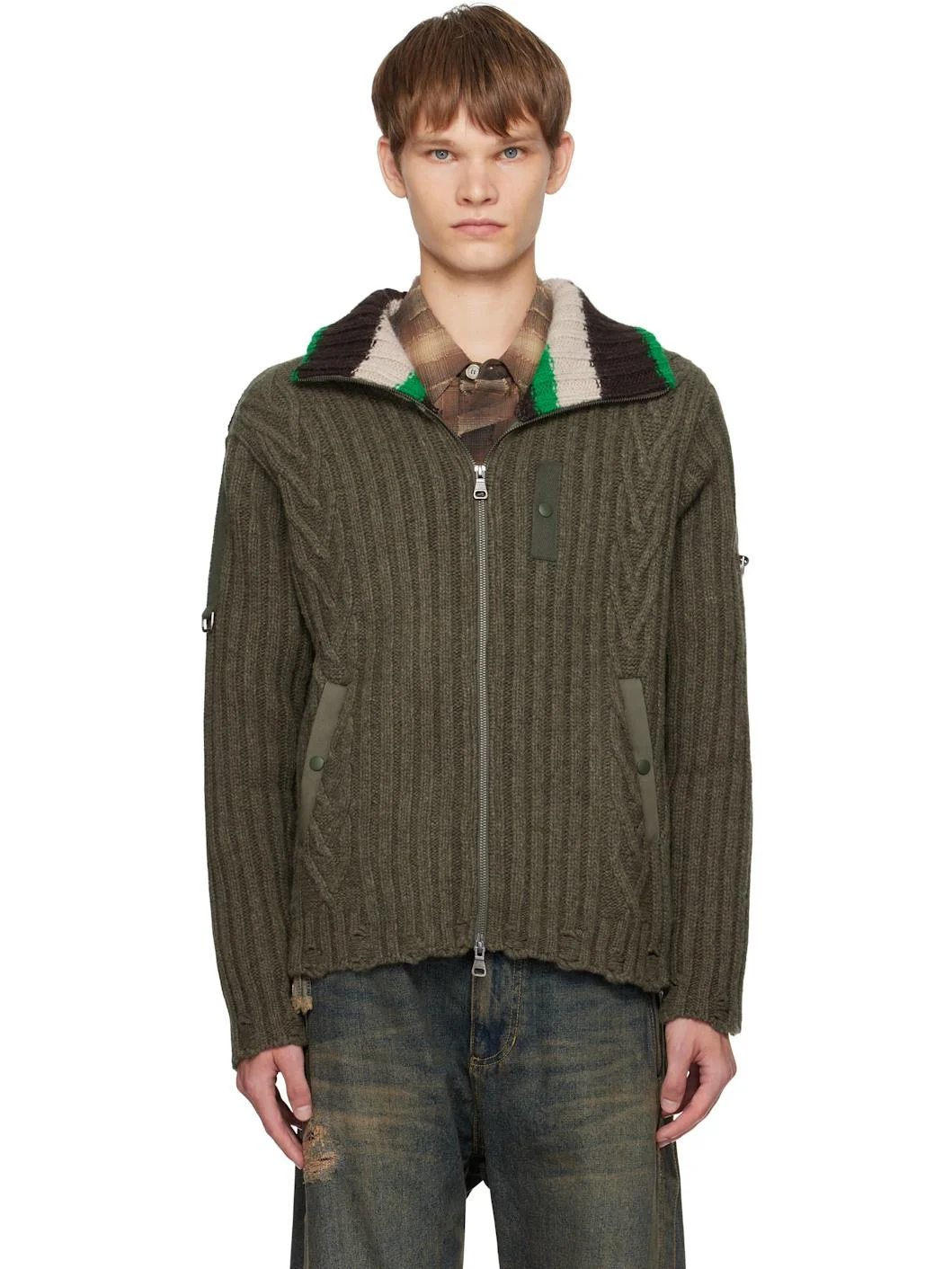 Rib-knit wool-blend sweater. · Distressing throughout · Stripes at stand collar and back · Two-way zip closure · Webbing trim at chest and sleeves · D-ring at sleeves · Twill elbow patches Supplier color: Khaki Body: 65% wool, 35% nylon. Trim 1: 53% acrylic, 22% nylon, 18% wool, 7% alpaca. Trim 2: 70% cotton, 30% nylon. Made in South Korea 252375M212002