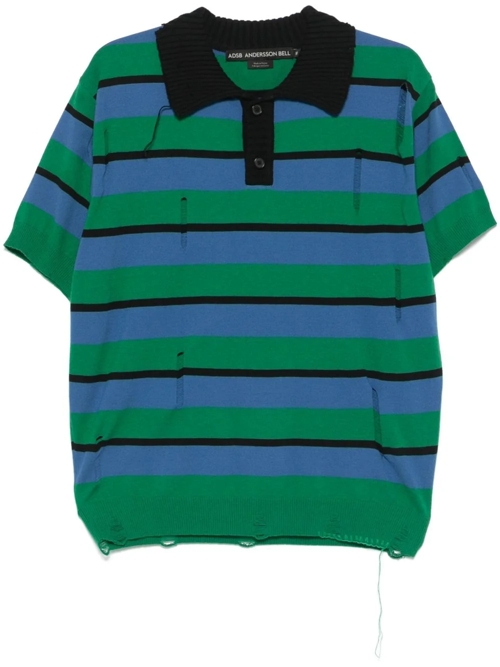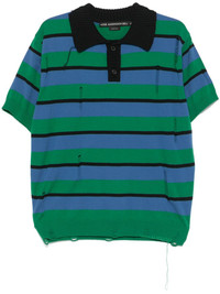 damaged striped polo shirt Highlights - Cerulean blue - Short front button fastening - Ribbed cuffs and hem - Ripped detailing Imported Composition Acrylic 41%, Polyester 36%, Cotton 23% SIZE & FIT Model measurements Height 6 ft 1 in(1.86 m) Bust/Chest 37.4 in(95 cm) Hips 36.22 in(92 cm) Waist 29.52 in(75 cm) FittingInformation Designed for a relaxed fit, this polo shirt offers comfort and movement The ribbed hem offers a close, comfortable fit Made with a midweight knit, this piece offers some stretch