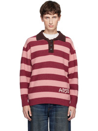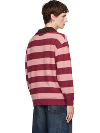 Knit wool-blend polo. · Jacquard stripes throughout · Rib-knit spread collar, hem, and cuffs · Three-button placket · Logo embroidered at front hem · Logo plaque at back collar Supplier color: Pink/Red wine 47% wool, 39% nylon, 14% polyester. Made in South Korea 252375M212003
