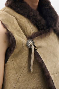 Addie Asymmetric Fur Waistcoat – Suede Felted Shearling – Asymmetric Cut with Raw Edges – Open Front Design – Oversized Shearling Collar and Inner Lining – Patchwork Construction with Visible Seams – Cropped Back, Elongated Front Panels – Soft Textured Finish – 100% Lamb Leather – Made in Italy Model wears size M Care To maintain the beauty and integrity of your purchase, we recommend treating it with care. Simple maintenance practices, such as gentle washing and proper storage, can effectively preserve the longevity of your favorites. We encourage you to refer to the care instructions included with each item, designed to help you keep your purchase in top condition. Design Our dedication to excellence extends beyond materials; it encompasses the artistry and craftsmanship illustrated in every piece we create.