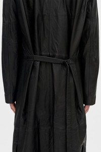 Adonis Coat - Black - structured satin leather - notched collar - button closure - adjustable and removable leather belt - side splits - 100% Lamb Leather - Made in Italy Model wears italian size 48 The fit of this item is regular. Consider to purchase your usual size. Care To maintain the beauty and integrity of your purchase, we recommend treating it with care. Simple maintenance practices, such as gentle washing and proper storage, can effectively preserve the longevity of your favorites. We encourage you to refer to the care instructions included with each item, designed to help you keep your purchase in top condition. Design Our dedication to excellence extends beyond materials; it encompasses the artistry and craftsmanship illustrated in every piece we create.