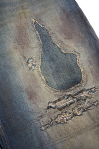 Ann Demeulemeester Distressed Olan 5-Pockets High Comfort Trousers combine high comfort with editorial edge. Five-pocket construction, front button closure, and belt loops meet distressed detailing and patchwork overlays for a distinctly deconstructed aesthetic. Vintage blue finish. Oversized, baggy fit. DETAILS 100% Cotton Made in Italy