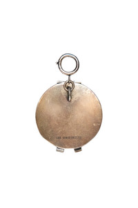The Ann Demeulemeester Jannina Rounded Mirror Charm in antique sterling silver featuring concealed rounded mirror surface, hoop closure, engraved logo, and grid detailing. This item is final sale and is not eligible for return or exchange. DETAILS - Silver concealed mirror charm - Logo detailing at back - Hoop closure - Grid detailing - Made in Italy Material: 100% Silver (925) Product codes: - SKU: ESSX/ANN/2402UJC08JW020070/SLVR/O_S - UPC: 8059690338933