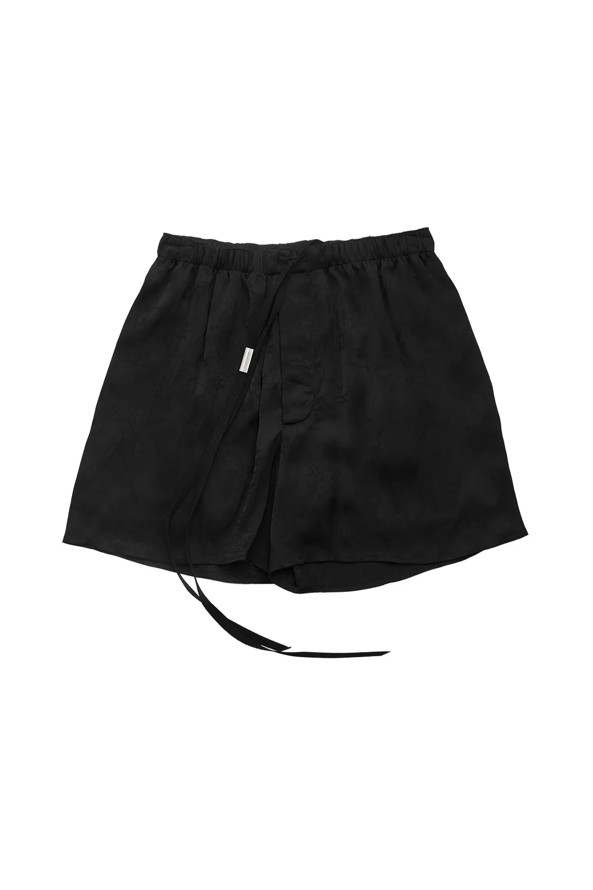 The Ann Demeulemeester Jemi Boxer Shorts in washed silk featuring tonal jacquard florals throughout, a relaxed-fit, elasticated waistband, side pockets, and grosgrain drawstring with signature silver-tone logo-engraved plaque. 16" long. DETAILS - Jacquard floral fabrication - Relaxed-fit - Side pockets - Grosgrain drawstring - Elasticized waistband - Button fly Sizing: - True to size Material: Silk Made in Italy Product codes: - SKU: ESSX/ANN/SS25/B0012473FA611099/Black/XS - UPC: 8059690427903