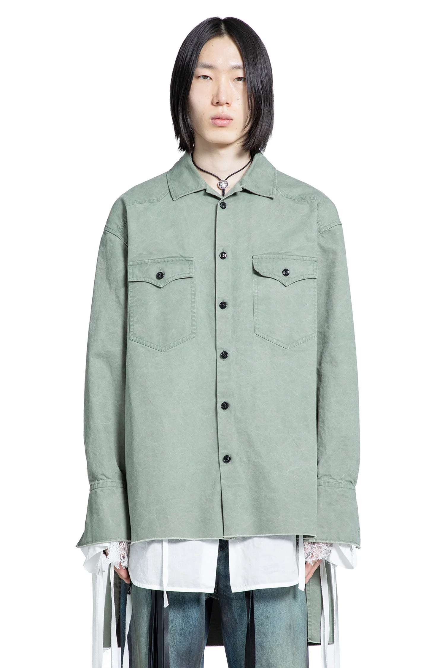 DESCRIPTION - Sage - Washed cotton canvas - Worn-effect - Western stitching details - Classic collar - Button closure - Dropped shoulders - Long sleeves - Buttoned cuffs - Dropped back - Elongated raw-edge hem - Oversized fit DETAILS - Made in: Italy - Composition: 100% Cotton - Model code: B0013485FA666 048 - Item ID: 9796693623126