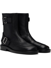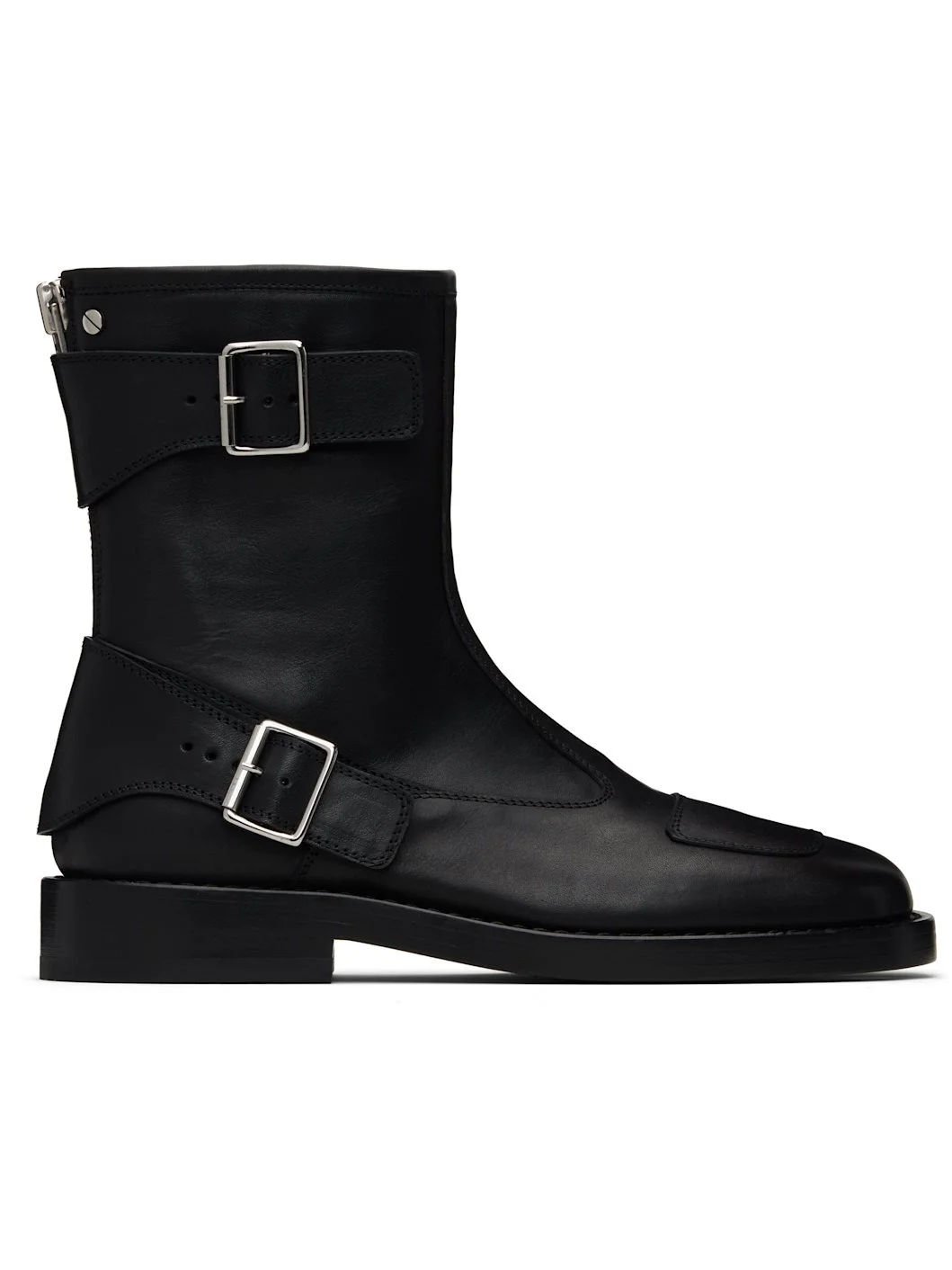 Ankle-high grained calfskin boots. · Leather patch at vamp · Buckle straps at side and collar · Zip closure at heel · Leather lining · Suede sole with rubber heel · Heel: H1.5" Supplier color: Black Upper: calfskin. Sole: rubber. Made in Italy 252378M228002