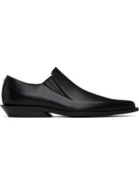 Buffed calfskin loafers in black. · Pointed toe · Gusset at sides · Rivet at heel collar · Buffed calfskin and nubuck lining · Stacked block heel with rubber injection · Polished leather sole · Heel: H1" Supplier color: Black Upper: calfskin. Sole: leather, rubber. Made in Italy 251378M231000