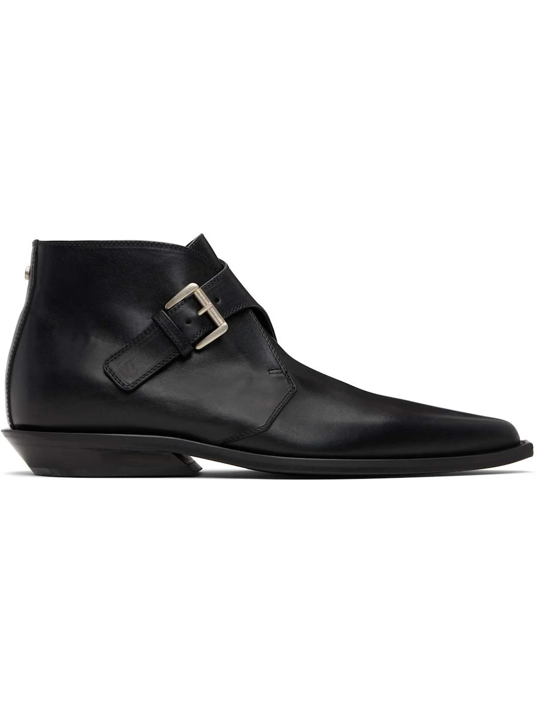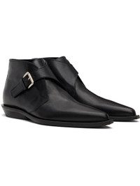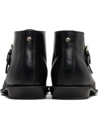 Ankle-high buffed leather boots. · Pointed toe · Pin-buckle strap at vamp · Rivet at heel collar · Stacked leather heel with rubber injection · Leather sole Supplier color: Black Upper: leather. Sole: leather, rubber. Made in Italy 251378M228001