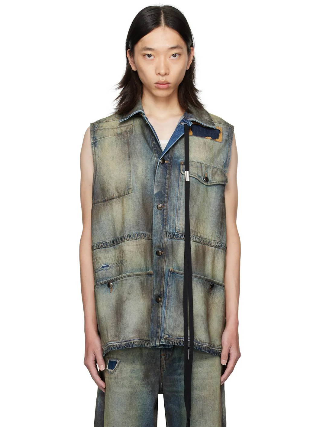 Sleeveless non-stretch denim jacket. · Discoloration, distressing, and sprayed dye throughout · Topstitched patches throughout · Spread collar · Detachable ribbon with logo plaque at collar · Button closure · Flap pockets at chest and back waist · Buttoned patch pockets at waist · Contrast stitching in brown Supplier color: Vintage blue 100% cotton. Made in Italy 252378M177002