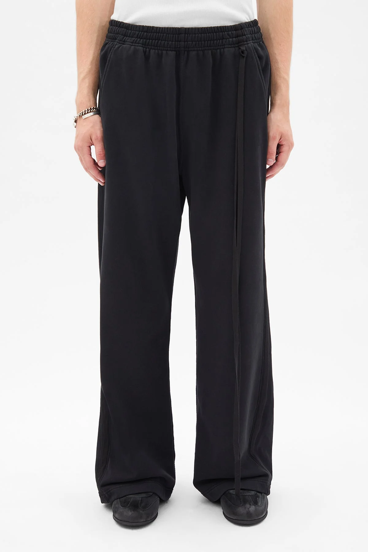 Boas Comfort Sweatpants - Black - 100% Cotton - Herringbone Side Band - Elastic Waist - Side Pockets - Wide Leg - Relaxed Fit - Made in Portugal Model wears italian size M Care To maintain the beauty and integrity of your purchase, we recommend treating it with care. Simple maintenance practices, such as gentle washing and proper storage, can effectively preserve the longevity of your favorites. We encourage you to refer to the care instructions included with each item, designed to help you keep your purchase in top condition. Design Our dedication to excellence extends beyond materials; it encompasses the artistry and craftsmanship illustrated in every piece we create.