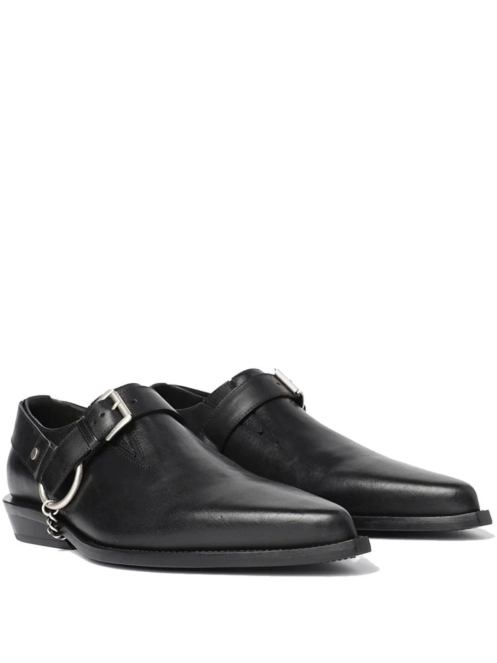 Pointy buckle-detail leather monk shoes Highlights - Black - Pointed toe - Buckle detail - Low stacked heel Made in Italy Composition Outer: Calf Leather 100% Lining: Calf Leather 100% Sole: Calf Leather 100%