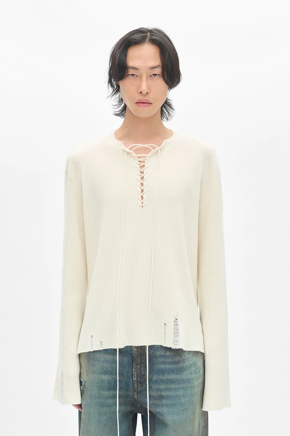 Deder Lace Up Serafino Sweater - White - Lace-up V-neck with tonal cord -Straight Hem With Subtle Distressing - 70% Wool, 30% Cashmere - Made in Italy Model wears italian size M Care To maintain the beauty and integrity of your purchase, we recommend treating it with care. Simple maintenance practices, such as gentle washing and proper storage, can effectively preserve the longevity of your favorites. We encourage you to refer to the care instructions included with each item, designed to help you keep your purchase in top condition. Design Our dedication to excellence extends beyond materials; it encompasses the artistry and craftsmanship illustrated in every piece we create.