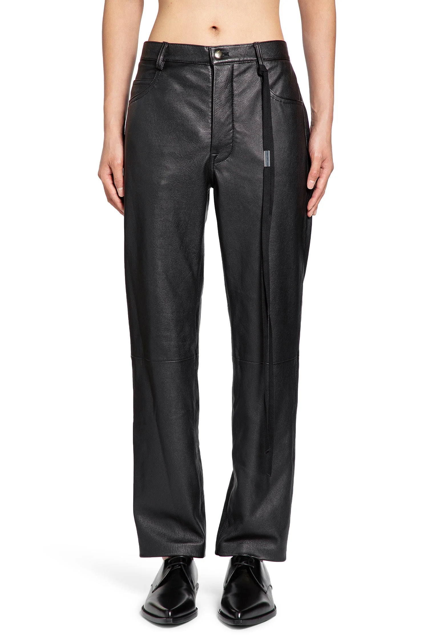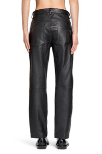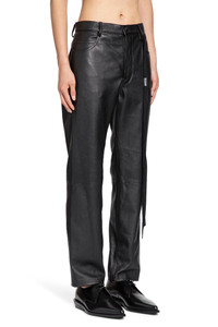 DESCRIPTION - Runway style - Black - Satin structured leather - Belt holes - Removable signature grosgrain ribbon - Button and zip closure - 5 pockets - Slighty tapered leg - Slim fit DETAILS - Made in: Italy - Composition: 100% Lambskin - Model code: B0011712LT038 099 - Item ID: 9769627517270 SIZE & FIT Model wears size 48 Model Height 188 cm Chest 88 cm Waist 69 cm Hips 88 cm