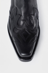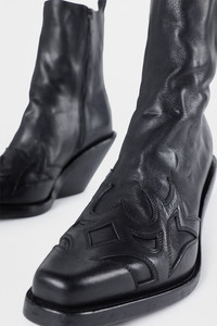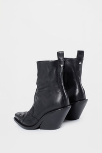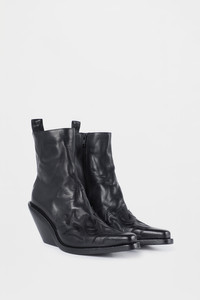 Heimo Ankle Boots - Black - Washed Grained Calfskin - Western Graphic Overlays - Pointed Toe - Back Signature Rivet - Back Pull Tab - Side Zip Closure - Leather Sole - Wedge Heel - 100% Calf Leather - Made in Italy Ann Demeulemeester shoes embody the essence of luxury and comfort. The generously wide fit is a design choice aimed at ensuring a comfortable wear. For those who prefer a snugger fit, we recommend using an insole. Crafted from the highest quality leather, it is natural for the shoes to feel stiff initially. By wearing and walking in them, they will perfectly mold to the shape of your feet, offering unparalleled comfort. The fit of this item is regular. Consider to purchase your usual size. Care To maintain the beauty and integrity of your purchase, we recommend treating it with care. Simple maintenance practices, such as gentle washing and proper storage, can effectively preserve the longevity of your favorites. We encourage you to refer to the care instructions included with each item, designed to help you keep your purchase in top condition. Design Our dedication to excellence extends beyond materials; it encompasses the artistry and craftsmanship illustrated in every piece we create.