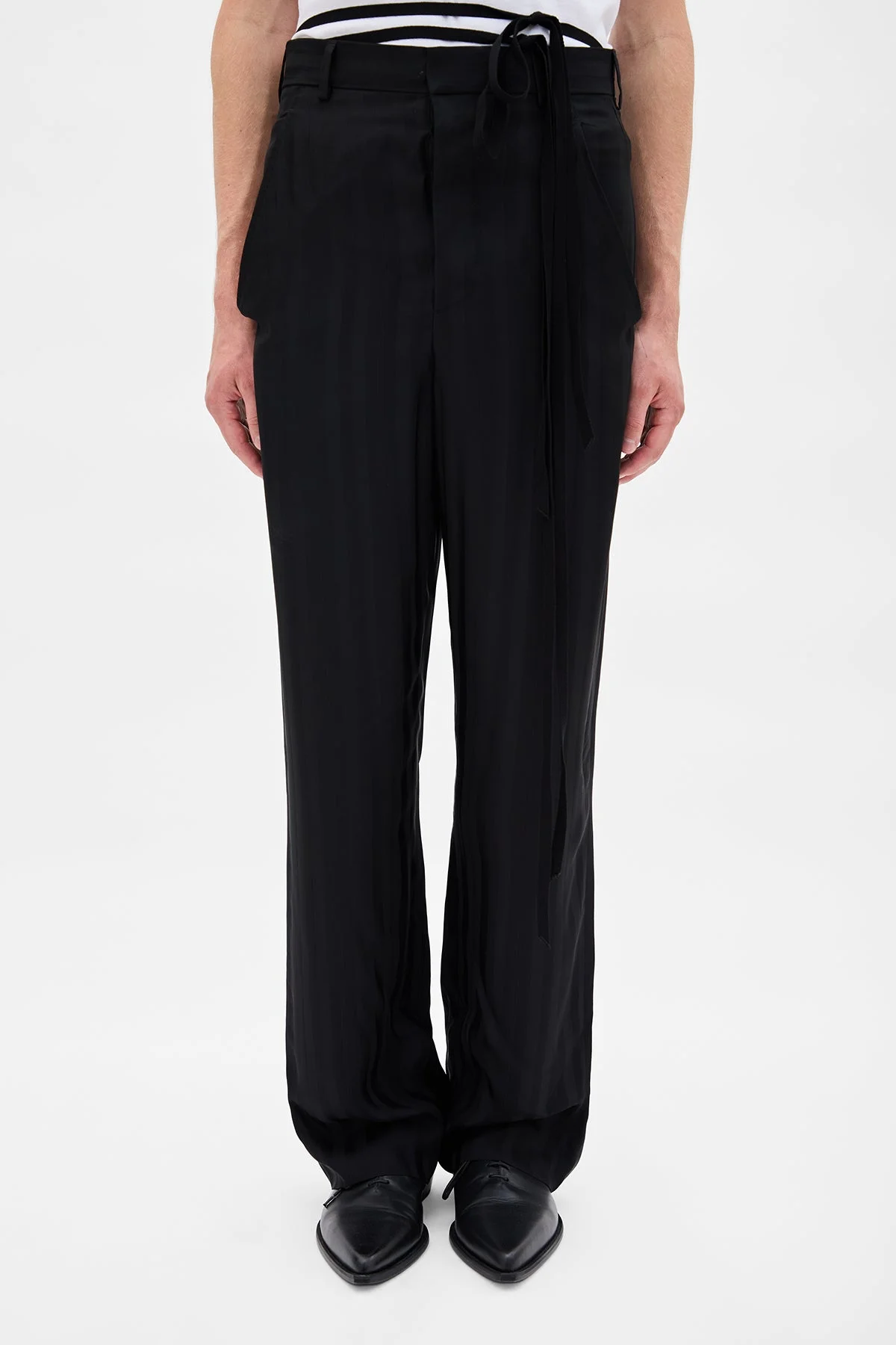 Leon Comfort Fit Trousers - Black - Striped Viscose - Belt Holes - Removable Signature Grosgrain Ribbon - Hook and Zip Closure - Side Pockets - Asymmetric Back Pockets - Straight fit -100% Viscose - Made in Italy The model wears italian size 46 The fit of this item is oversize. Consider this information when you select the size. Care To maintain the beauty and integrity of your purchase, we recommend treating it with care. Simple maintenance practices, such as gentle washing and proper storage, can effectively preserve the longevity of your favorites. We encourage you to refer to the care instructions included with each item, designed to help you keep your purchase in top condition. Design Our dedication to excellence extends beyond materials; it encompasses the artistry and craftsmanship illustrated in every piece we create.