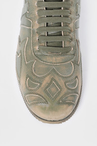 Milton Low-Top Sneakers- Distressed Leather - Sage - Tonal Overlay Detailing - Round Toe - Front Lace-Up Closure - Cotton Lining - Slim Rubber Sole - 100% Calf Leather, 100% Cotton - Made in Italy Ann Demeulemeester shoes embody the essence of luxury and comfort. The generously wide fit is a design choice aimed at ensuring a comfortable wear. For those who prefer a snugger fit, we recommend using an insole. Crafted from the highest quality leather, it is natural for the shoes to feel stiff initially. By wearing and walking in them, they will perfectly mold to the shape of your feet, offering unparalleled comfort. The fit of the item is slim. Please consider this when selecting your size. Care To maintain the beauty and integrity of your purchase, we recommend treating it with care. Simple maintenance practices, such as gentle washing and proper storage, can effectively preserve the longevity of your favorites. We encourage you to refer to the care instructions included with each item, designed to help you keep your purchase in top condition. Design Our dedication to excellence extends beyond materials; it encompasses the artistry and craftsmanship illustrated in every piece we create.