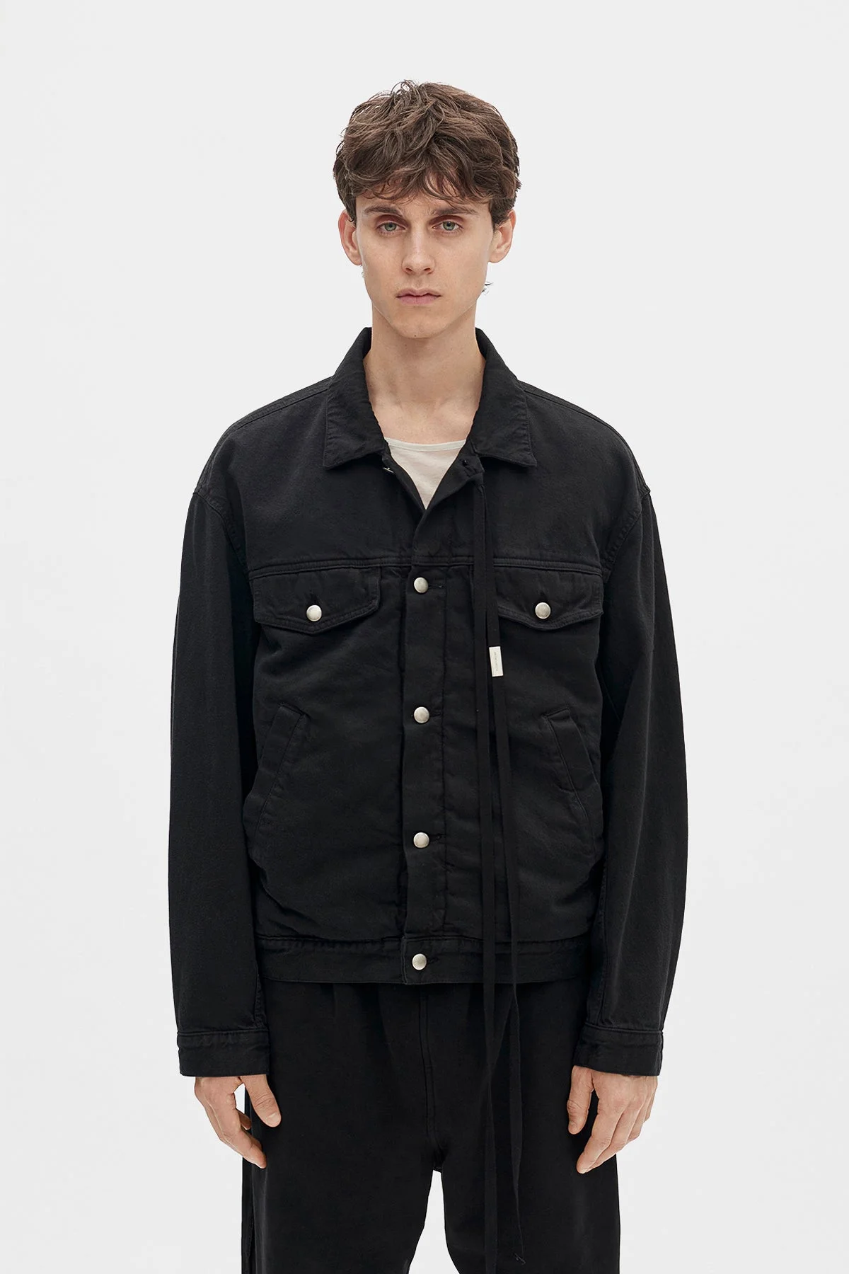 Men's Patrick five pockets jacket- Black Denim- Over Size Fit- Black ribbon detail- button closure- 100% Cotton- Made in Italy Model wears Italian size 48 Height: 188 cm Waist: 73 cm Hips: 86 cm