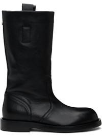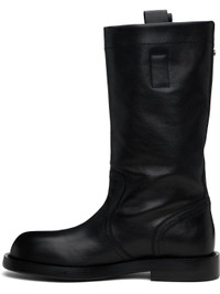 Mid-calf grained and buffed leather slip-on boots in black. · Pull-loops at collar · Rivet at heel counter · Buffed leather and nubuck lining · Stacked leather block heel with rubber injection · Polished leather sole · Heel: H1.25" Supplier color: Black Upper: leather. Sole: leather, rubber. Made in Italy 251378M255000