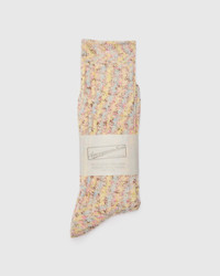 The Homespun series from AnonymousIsm is crafted using twisted boucle yarns creating a texture reminiscent of hand-spun fibers. Made with a flexible ribbed knitting, the socks are made at a standard crew cut length. - Crew cut length - Ribbed knit - Homespun boucle mix yarn - 64% cotton, 18% acryllic, 10% polyester, 7% nylon, 1% spandex - Made in Japan One size. Fits US 9-12.
