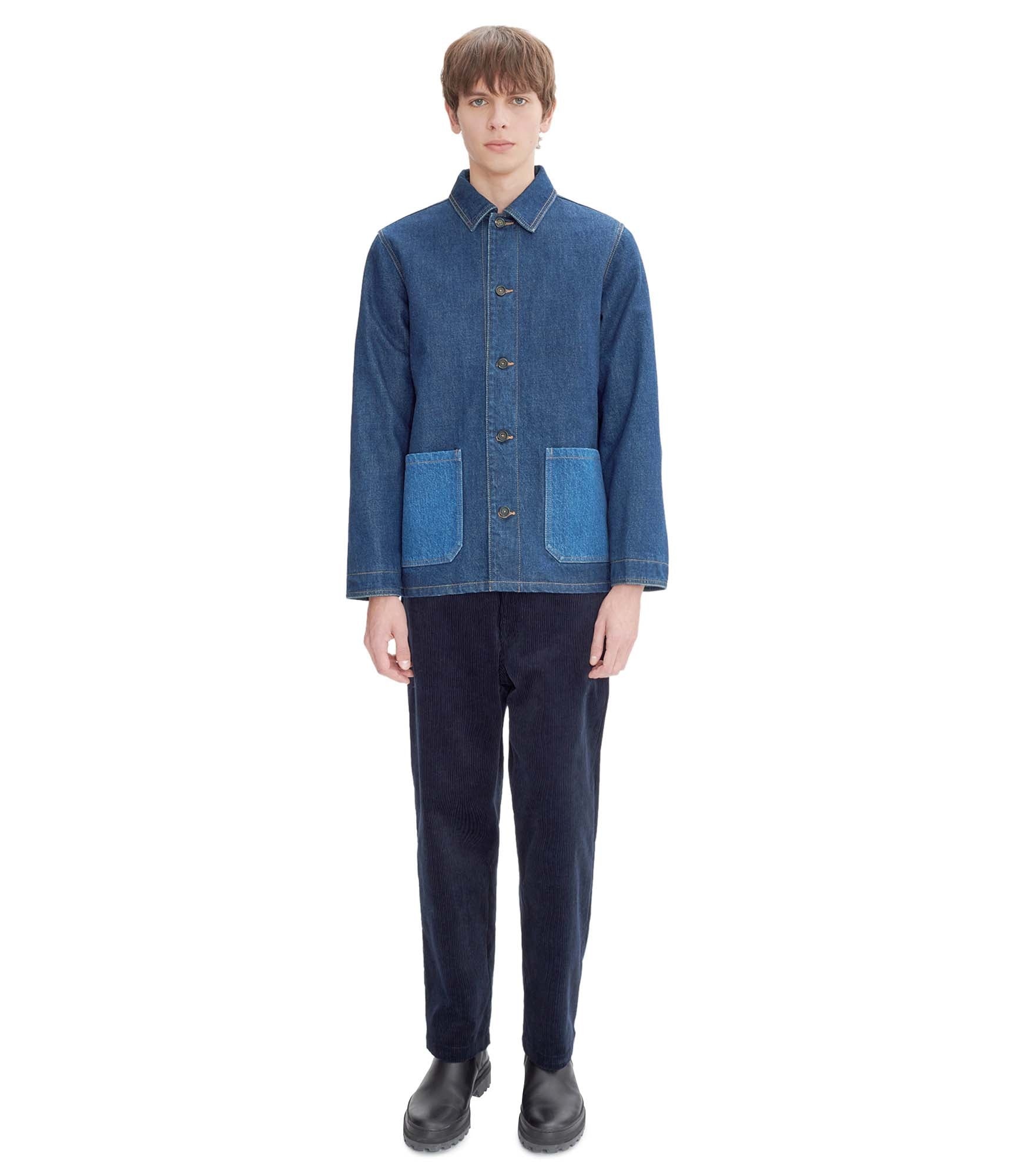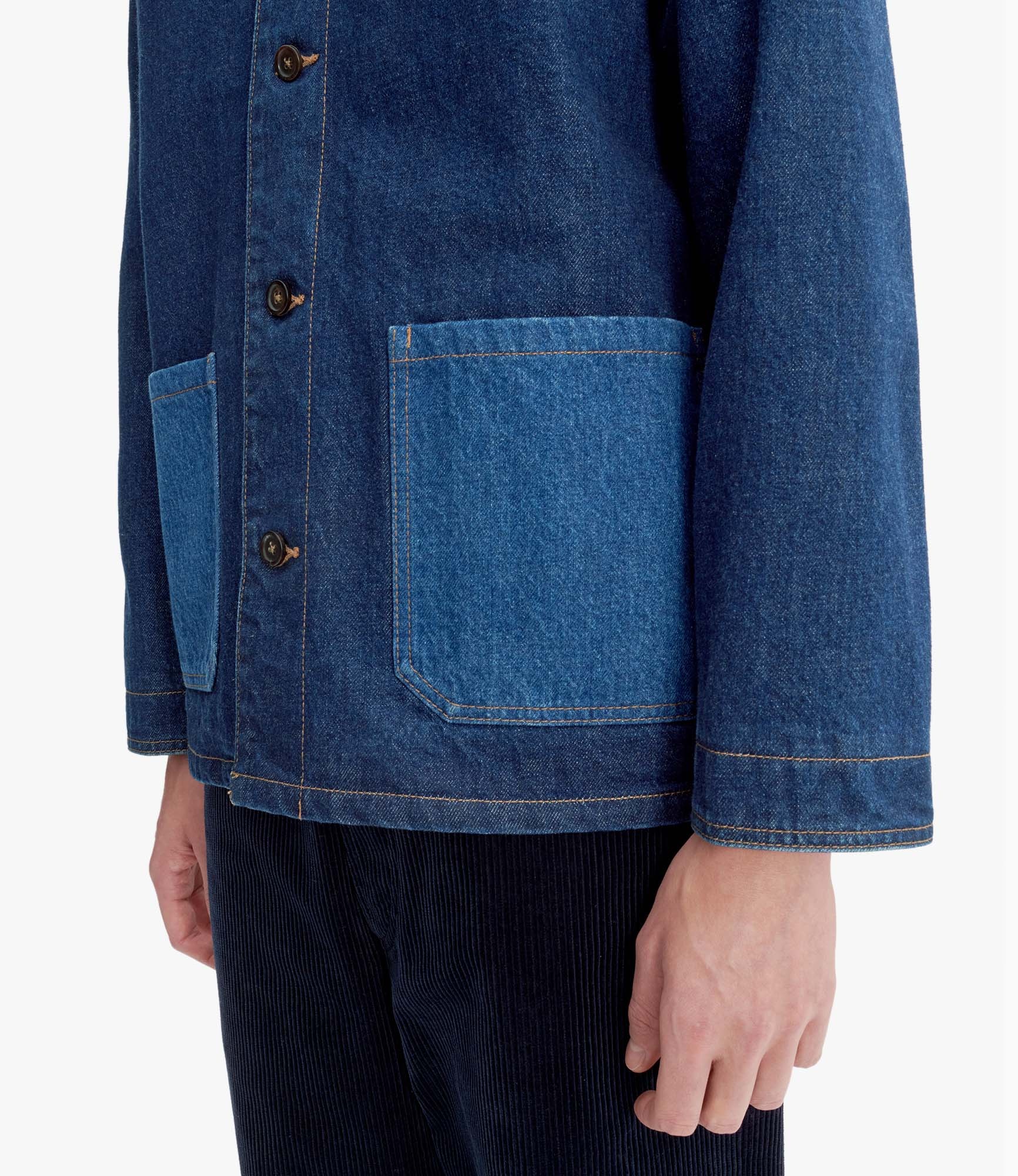 - Unisex model. - Organic Japanese denim material. - Straight cut. - Classic collar. - Closes with five faux horn buttons. - Two lighter stonewashed pockets at the bottom of the jacket. - Caramel A.P.C. embroidered at the bottom of the left pocket. - Plaid lining. - Tone-on-tone A.P.C. embroidered at the bottom of the left pocket. - Caramel topstitching. - 100% organic cotton. Size Advice - Till is 6'2 tall and is wearing size M. Composition & Material - 100% cotton. - Japanese material. - Made in Vietnam. - Dry clean only.