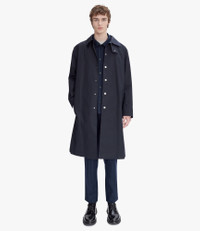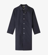 - English technical material coated with water-repellent wax but without a waxy feel. - Long straight cut. - Below-knee length. - Classic collar with a snap flap at the neck. - Two side pockets. - Back vent. - Plaid lining in the body and dark navy blue lining in the sleeves. - Snap closure with an A.P.C. logo. Size Advice - Leo is 6'2 tall and is wearing size M. Composition & Material - 100% cotton. - British material. - Made in Romania. - Dry clean only.