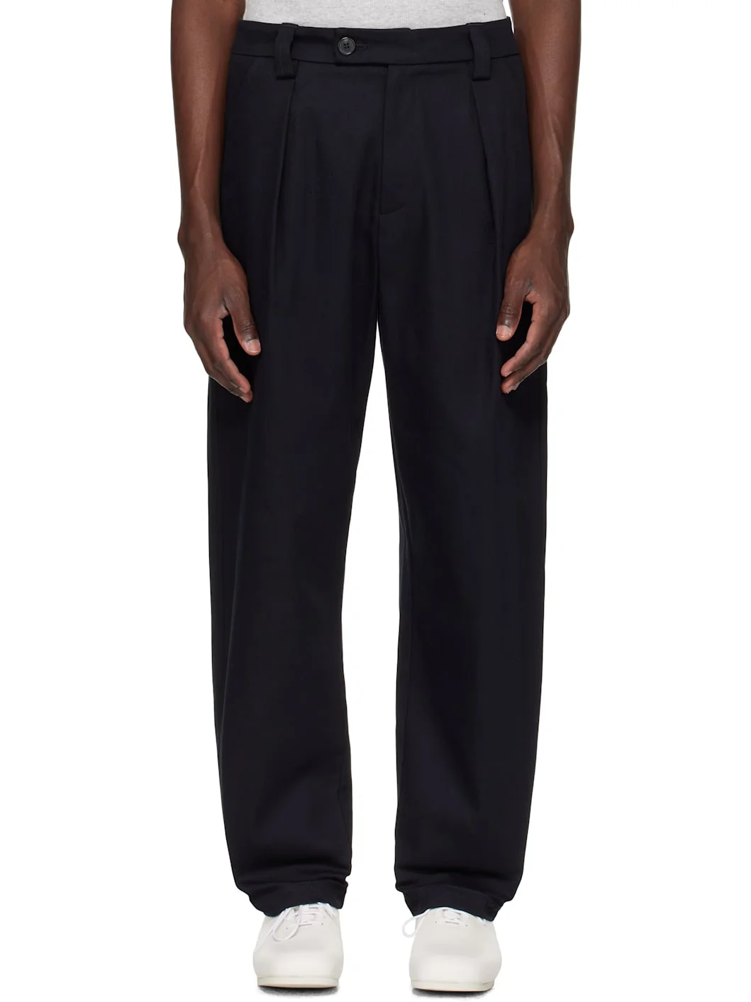Cotton- and wool-blend twill trousers. · Wide-leg · Belt loops · Three-pocket styling · Zip fly · Pleats at front · Darts at back waist Supplier color: Navy Blue 90% cotton, 10% wool. Made in Romania 252252M191012