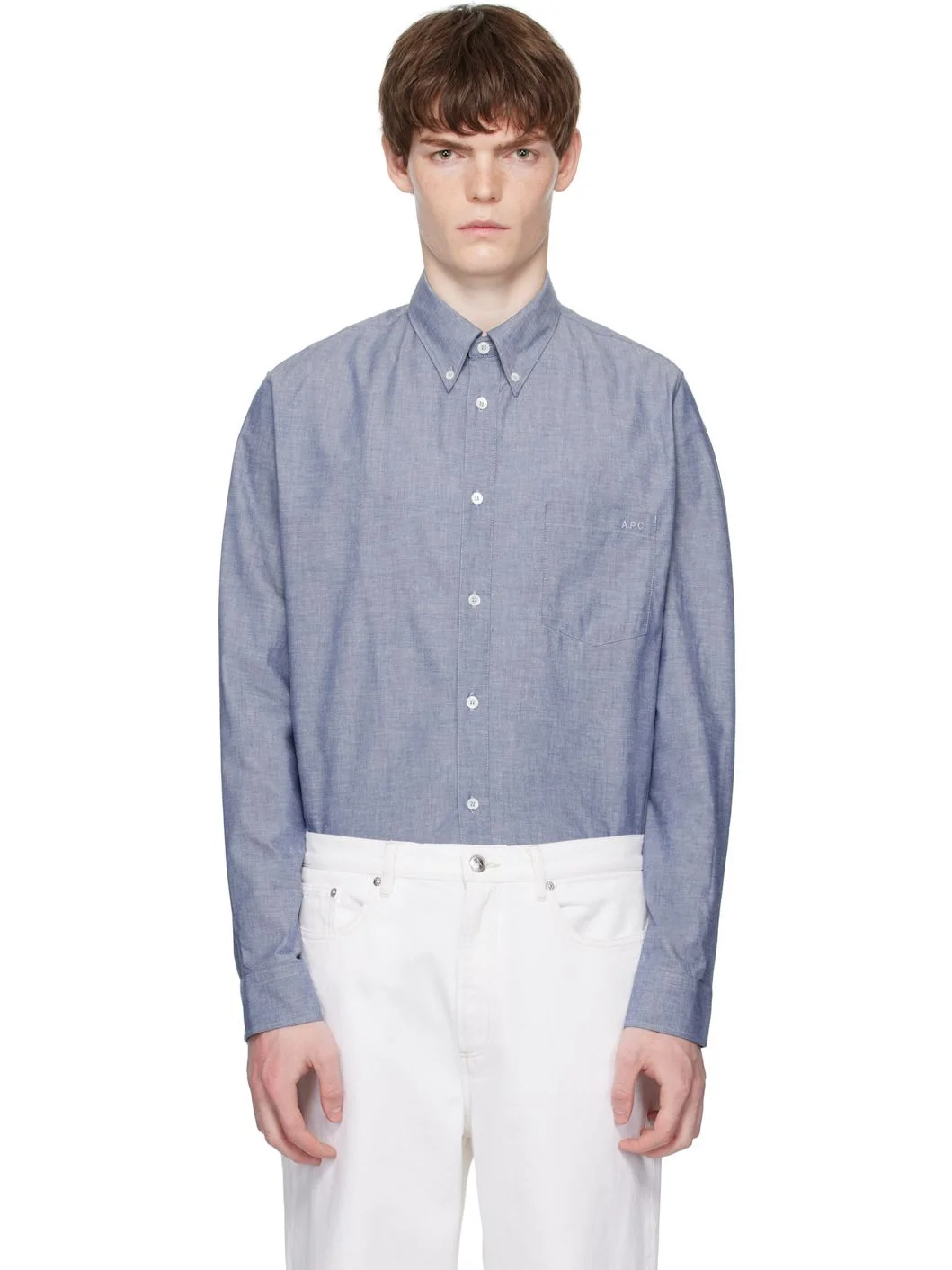 Cotton chambray shirt. · Spread collar · Button closure · Logo embroidered at patch pocket · Shirttail hem · Buttoned barrel cuffs · Twin pleats at back yoke Supplier color: Indigo 100% cotton. Made in Tunisia 252252M192008