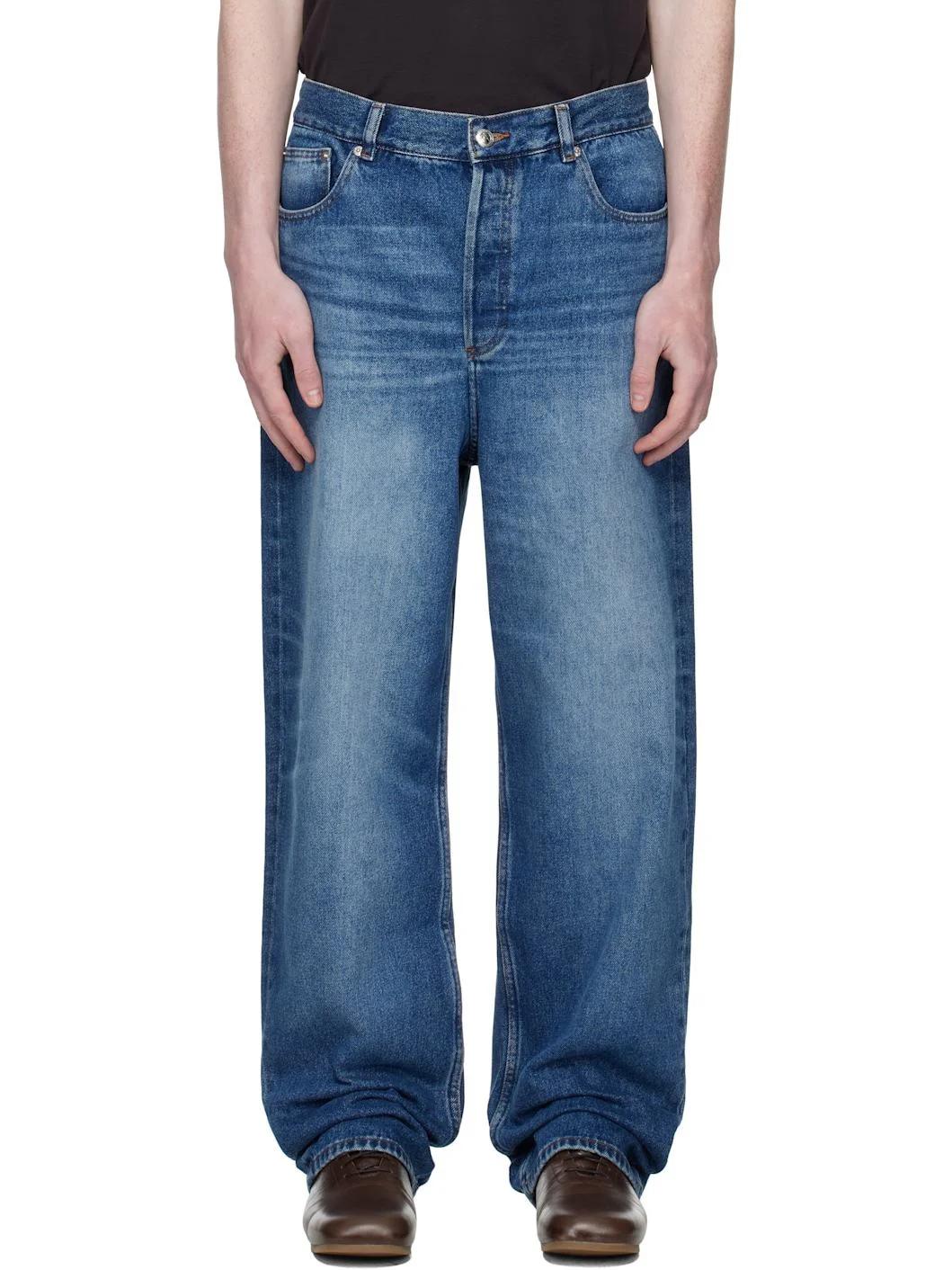 Stonewashed non-stretch denim jeans. · Fading and whiskering throughout · Wide-leg · High-rise · Belt loops · Five-pocket styling · Button fly · Contrast stitching in tan Supplier color: Stonewashed indigo 100% cotton. Made in Egypt 252252M186026