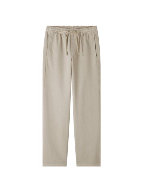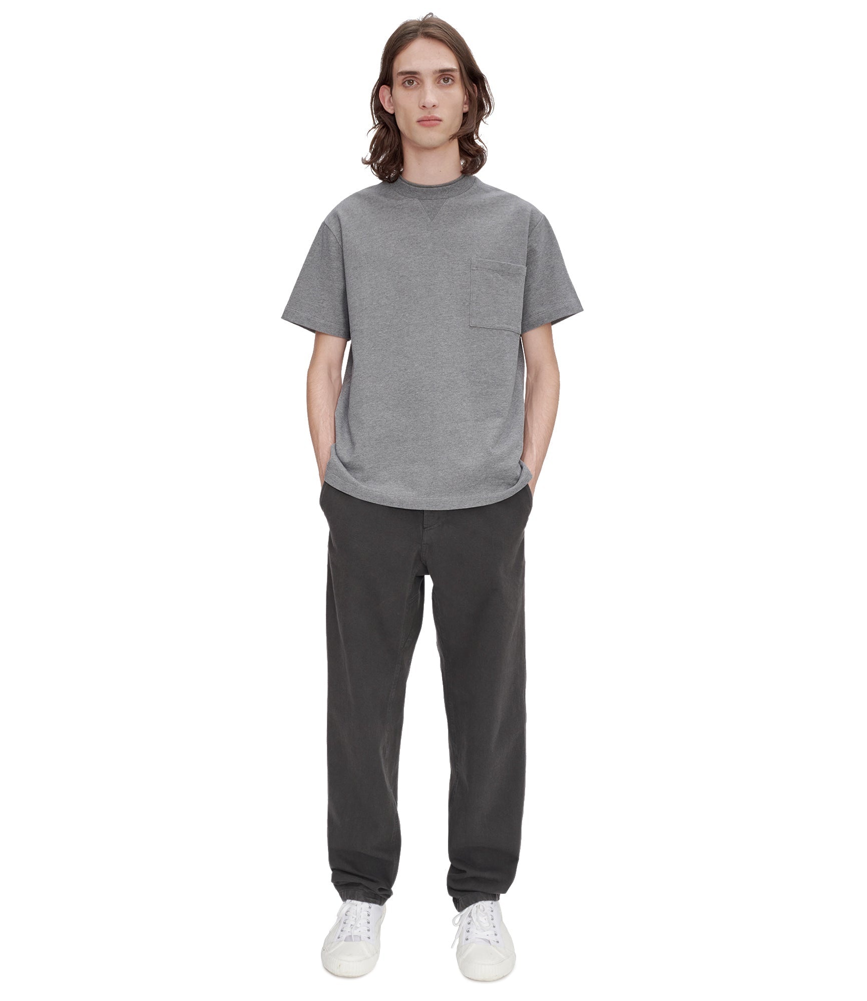A.P.C. Men's pants. - Straight slightly loose cut. - Elasticated waist. - Zip fly. - Side and back pockets. Pocket on leg. - Contains 25% cotton from organic farming and 25% recycled cotton. Size Advice - Nino is 6' tall and is wearing size 48. Composition & Material - 100% Cotton. - Spanish material. - Made in Tunisia. - Machine wash cold 65-85˚ F inside-out. Our commitments Through its RESPECT program A.P.C reduces (by implementing many practical measures to improve its environmental footprint) regulates (by respecting and enforcing its ethical responsibility on the part of its employees as well as its suppliers) and reuses (through its recycling vintage or quilts and butler programs for example).