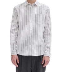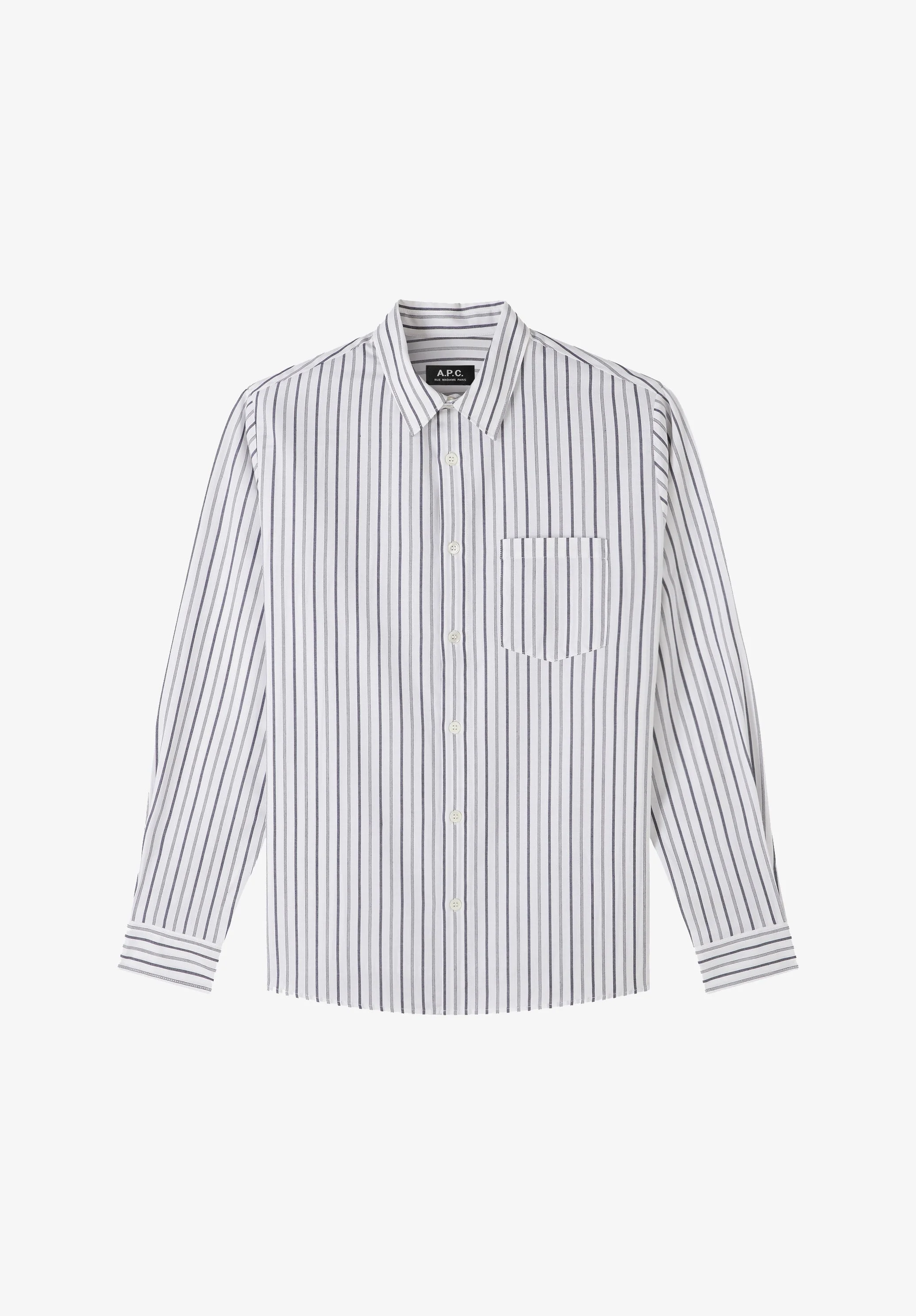 PRODUCT DETAILS - Straight, slightly loose cut. - Classic collar. - One pocket over the heart. - White mother-of-pearl buttons. - Original A.P.C. stripes. FABRIC & CARE - 90% cotton. 10% wool. - Made in Tunisia. - Machine wash 65-85°F, inside-out. SIZE - Hazem is 6'2" tall and is wearing size M.