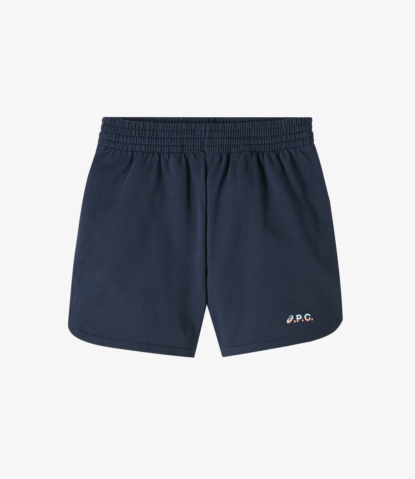 A.P.C. x Asics shorts. - Straight cut. - Mid-rise. - Elasticated waistband. - Two side pockets. - Multicolored A.P.C. and Asics logo on the left. - Rounded side slits. - 100% organic cotton. Size Advice - Leo is 6'2 tall and is wearing size M. Composition & Material - 100% cotton. - Portuguese material. - Made in Portugal. - Machine wash cold (86°F) inside-out.