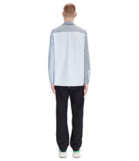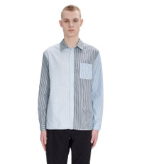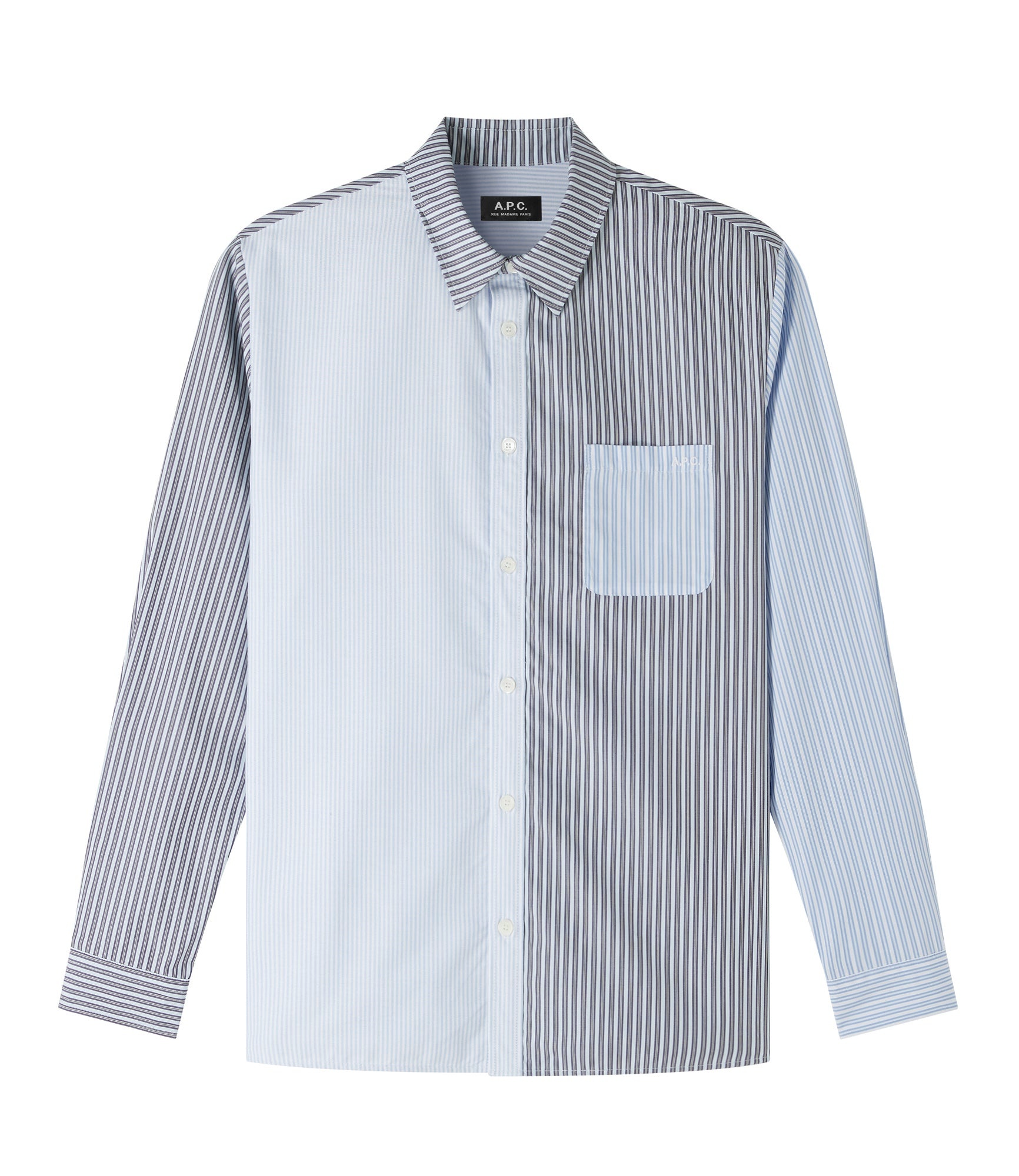 - Three fabrics: a blue Oxford cloth a blue-striped poplin and a green-striped poplin. - Straight cut. - Slightly sloping shoulders. - Classic collar. - Tone-on-tone A.P.C. logo embroidered over the heart. - Mother-of-pearl buttons. - 100% organic cotton. Size Advice - Tim is 6'2 tall and is wearing size M. Composition & Material - 100% cotton. - Portuguese material. - Made in Tunisia. - Machine wash cold (86°F) inside-out.