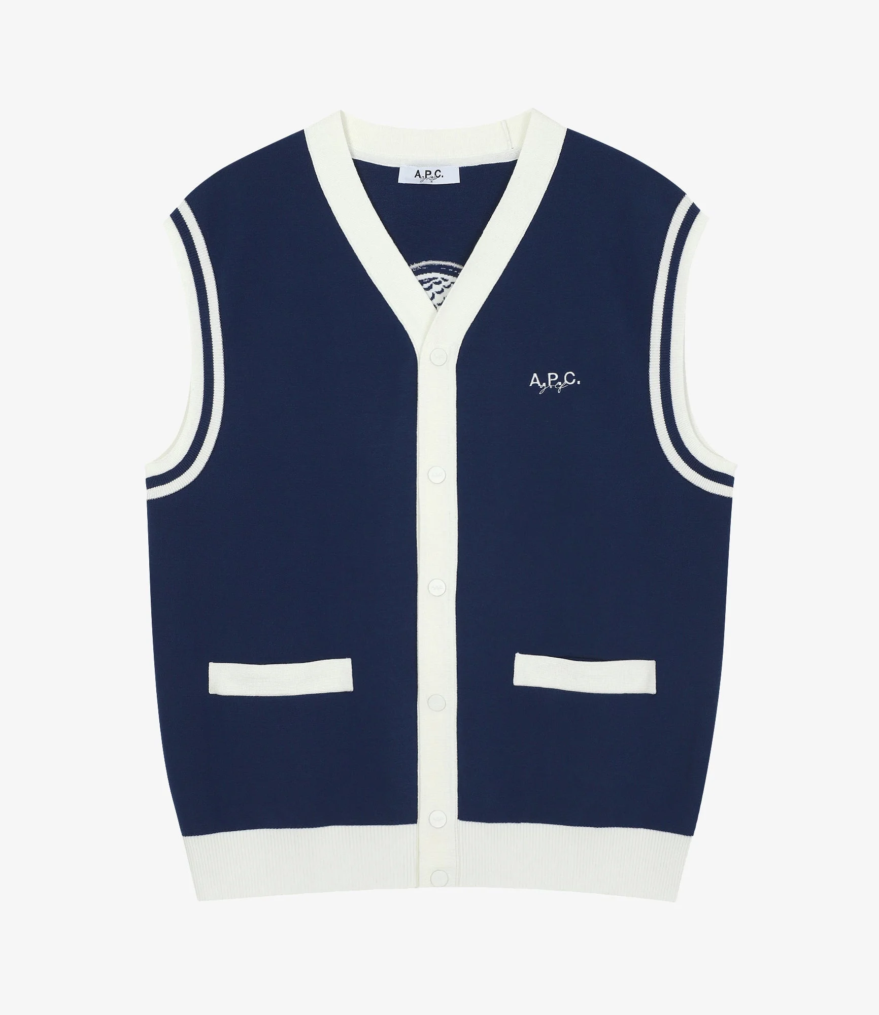 - Soft stretchable material. - Straight cut. - V-neck. - A.P.C. Golf Paris Since 2022 embroidered on the back. - Tone-on-tone buttoning. - Two side pockets. Size Advice - Igor is 6'5 tall and is wearing size M. Composition & Material - 62% rayon. 38% polyester. - Made in South Korea. - Dry clean only.