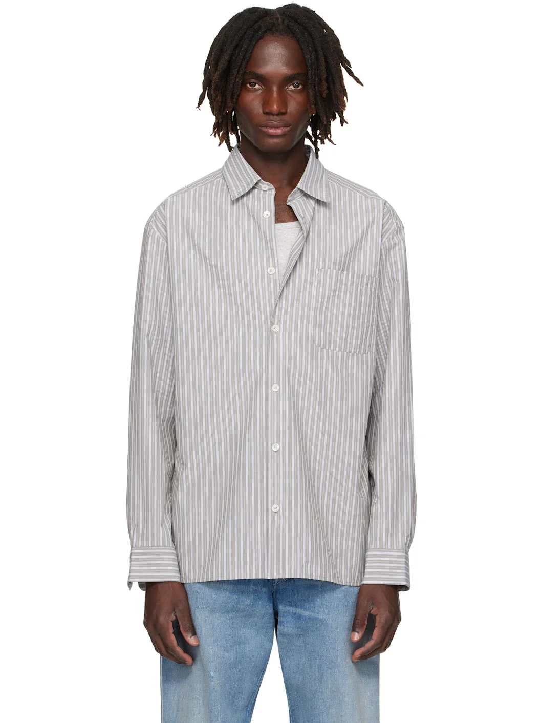 Cotton poplin shirt. · Stripe pattern throughout · Spread collar · Button closure · Patch pocket at chest · Button barrel cuffs · Logo-engraved mother-of-pearl hardware Supplier color: Gray Green 100% cotton. Made in Morocco 252252M192001