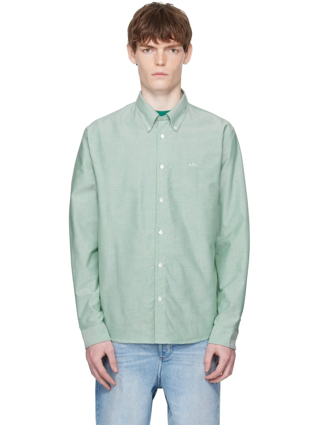 Plain-woven organic cotton shirt. · Striped throughout · Button-down spread collar · Button closure · Logo embroidered at chest · Shirttail hem · Buttoned barrel cuffs Supplier color: Almond Green 100% cotton. Made in Tunisia 252252M192020