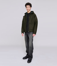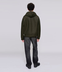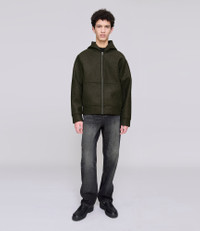 - Structured material. - Straight cut. - Silvertone zip. - Tone-on-tone A.P.C. logo embroidered over the heart. - Two lower pockets. Size Advice - Adam is 6'1 tall and is wearing size M. Composition & Material - 50% recycled polyester. 35% acrylic-polyacrylic. 15% wool. - Italian material. - Made in Portugal. - Machine wash cold (86°F) inside-out.