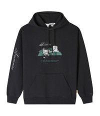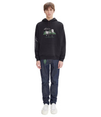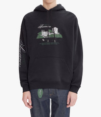A.P.C. x JJJJound hoodie. - Hotel Souvenirs can be reached at 1-888-220-8828. - Unisex model. - Heavyweight material (350 g). - Loose fit. - Crew neck with fleecy hood and tone-on-tone drawstrings. - Hotel Souvenirs screenprint with illustration on the front and on the right sleeve. - JJJJound embroidered on the bottom of the left sleeve and A.P.C. embroidered on the hood. - A.P.C. JJJJound label on the left side and Hotel Souvenirs label at the neck. - Kangaroo pocket. - 100% organic cotton. Size Advice - Till is 6'2 tall and is wearing size M. Composition & Material - 100% cotton. - Portuguese material. - Made in Portugal. - Machine wash cold (86°F) inside-out.