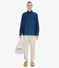 - Straight cut. - Classic collar. - Ecru A.P.C. logo embroidered over the heart. - Faux horn buttons. - Ecru topstitching. - 100% organic cotton. Size Advice - Tim is 6'2 tall and is wearing size M. Composition & Material - 100% cotton. - Italian material. - Made in Tunisia. - Machine wash cold (86°F) inside-out.