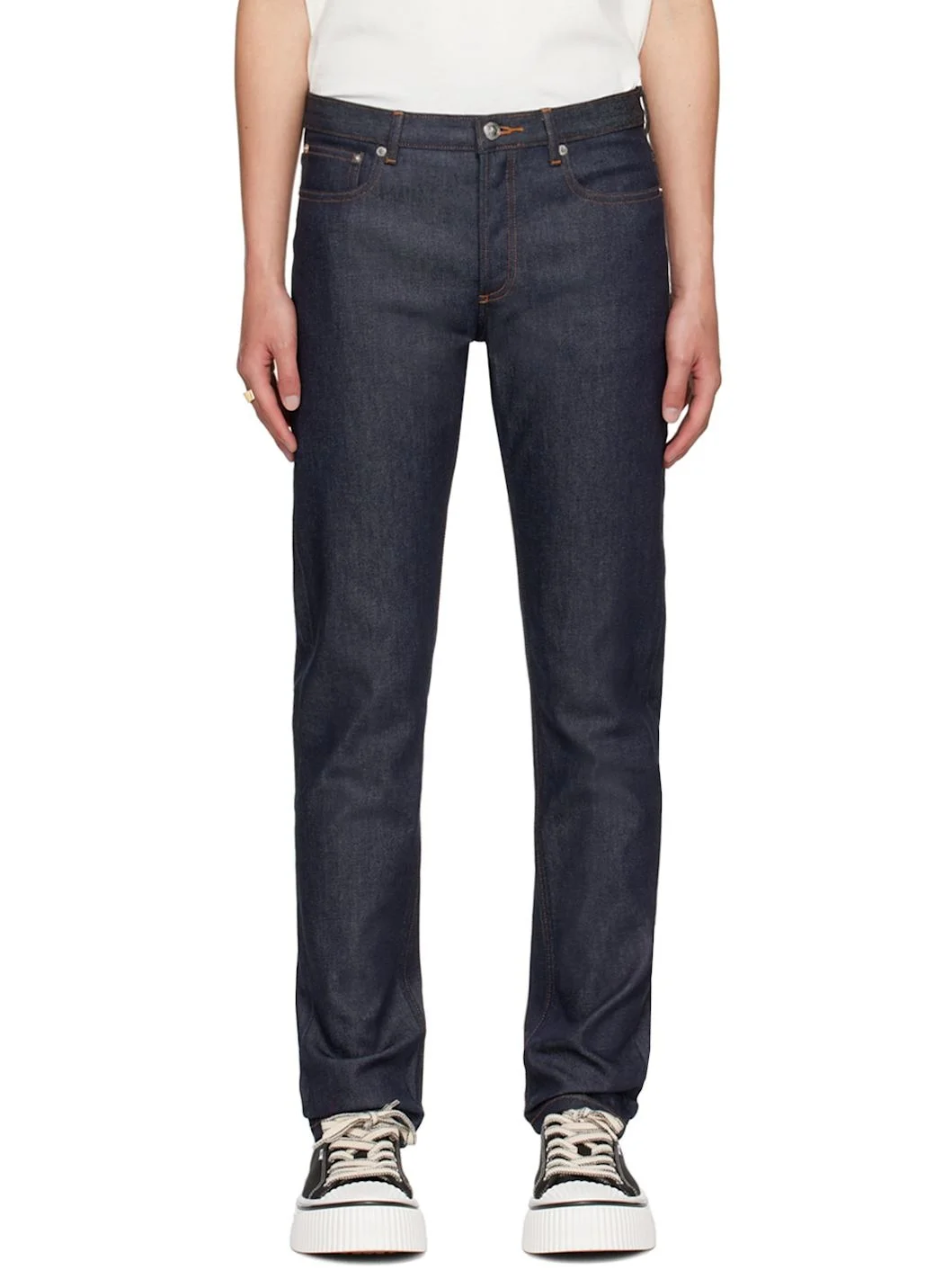Slim-fit tapered stretch denim jeans. · Mid-rise · Belt loops · Five-pocket styling · Button-fly · Logo-engraved silver-tone hardware · Contrast stitching in tan Supplier color: Indigo 98% cotton, 2% polyurethane. Made in Viet Nam 242252M186021