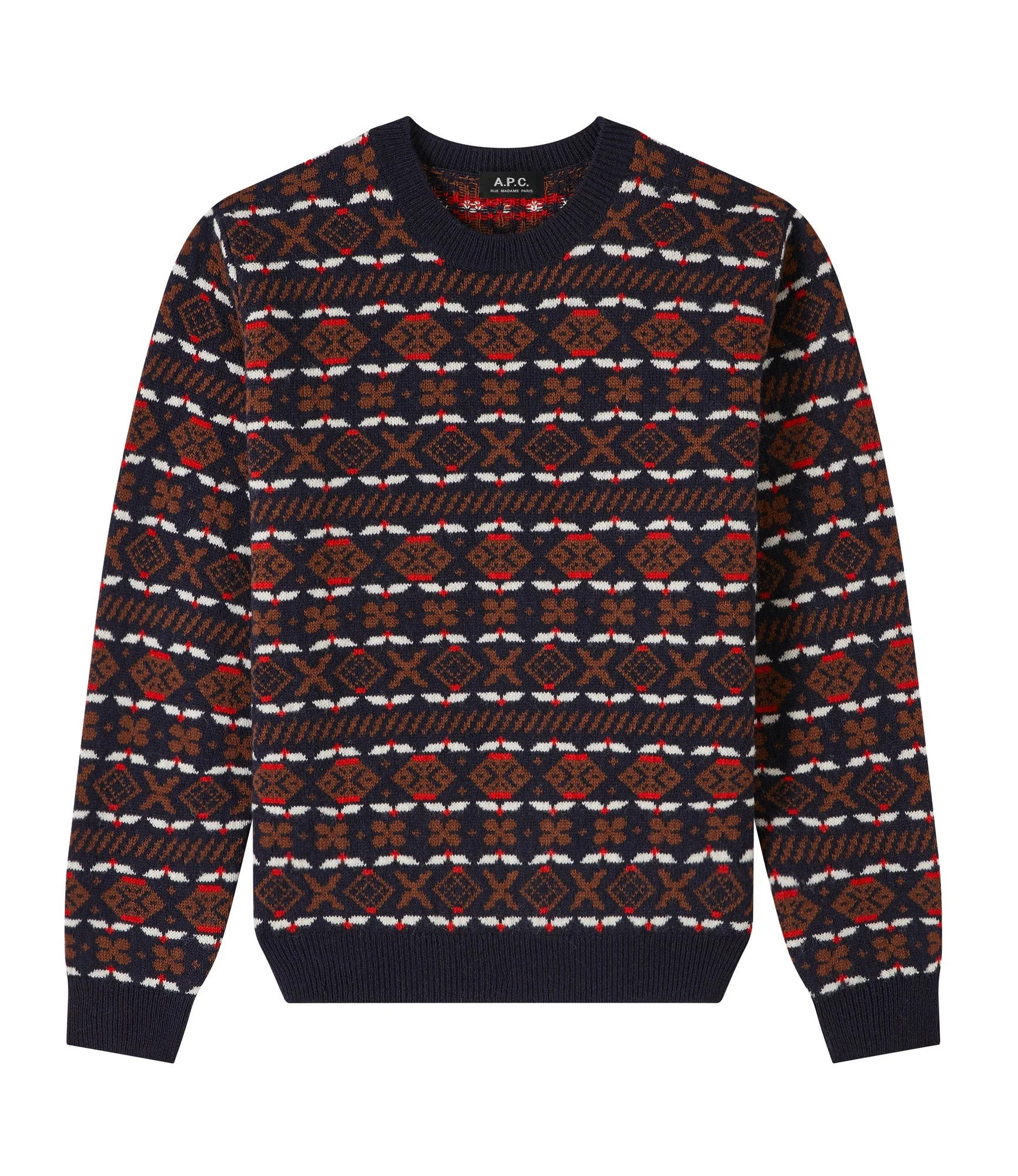 PRODUCT DETAILS A.P.C. Men's knit sweater. - Warm, rustic material. - Straight cut. - Crew neck. - Multicolored jacquard motif on the entire sweater. FABRIC & CARE - 100% super-long extra-fine Merino wool. - Made in Romania. - Hand wash or delicate cycle. SIZE - Jeranimo is 6'2" tall and is wearing size M.