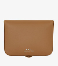 - Smooth vegetable-tanned leather. - Artisanally moulded leather. - Coin pocket. - Compartment with five card slots. - Rounded corners. - Snap flap closure. - Small embossed silvertone A.P.C. Rue Madame Paris logo on the front. Size Advice - Cotton lining. - Dimensions: 10 x 7.5 x 1.5 cm. - Cardholder with a credit card format. Composition & Material - 100% cowhide leather. - Spanish material. - Made in Spain. - Vegetable-tanned leather is produced with natural tannins. - Marks and traces that will develop on the leather are normal and are part of its natural patina process. Light colours will darken as well. - Leather must be protected from the sun heat and water. - Care instructions: wipe with a soft dry cloth.