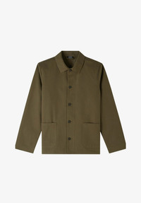 A.P.C. Men's jacket. - Italian material. - Straight cut. - Classic collar. - Five buttons. - Two waist pockets. - Hang loop at back of neck. - Unlined. - Tone-on-tone A.P.C. logo embroidered at bottom of left pocket. Size Advice - Model is 6'1 tall and is wearing size M. Composition & Material - 100% Cotton. - Italian material. - Made in Romania. - Machine wash (86°F) inside-out.