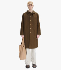 - English technical material coated with water-repellent wax but without a waxy feel. - Long straight cut. - Below-knee length. - Classic collar with a snap flap at the neck. - Two side pockets. - Back vent. - Tartan lining in the body and dark navy blue lining in the sleeves. - Snap closure with an A.P.C. logo. Size Advice - Leo is 6'2 tall and is wearing size M. Composition & Material - 100% cotton. - British material. - Made in Romania. - Dry clean only.