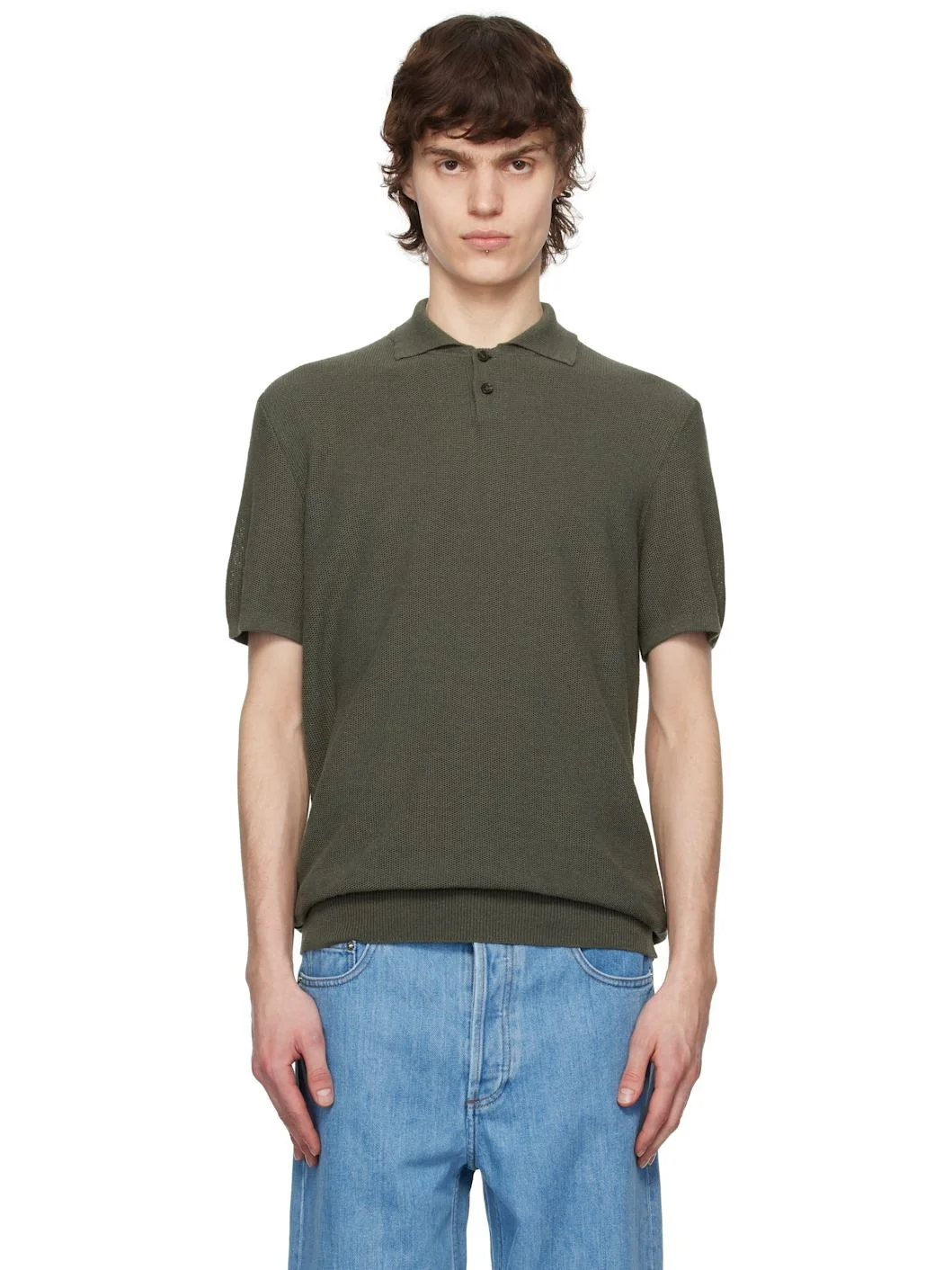 Lightweight knit viscose- and linen-blend polo. · Rib-knit spread collar, hem, and cuffs · Two-button placket · Corozo hardware Supplier color: Khaki 69% viscose, 27% linen, 4% polyamide. Made in Romania 251252M212012