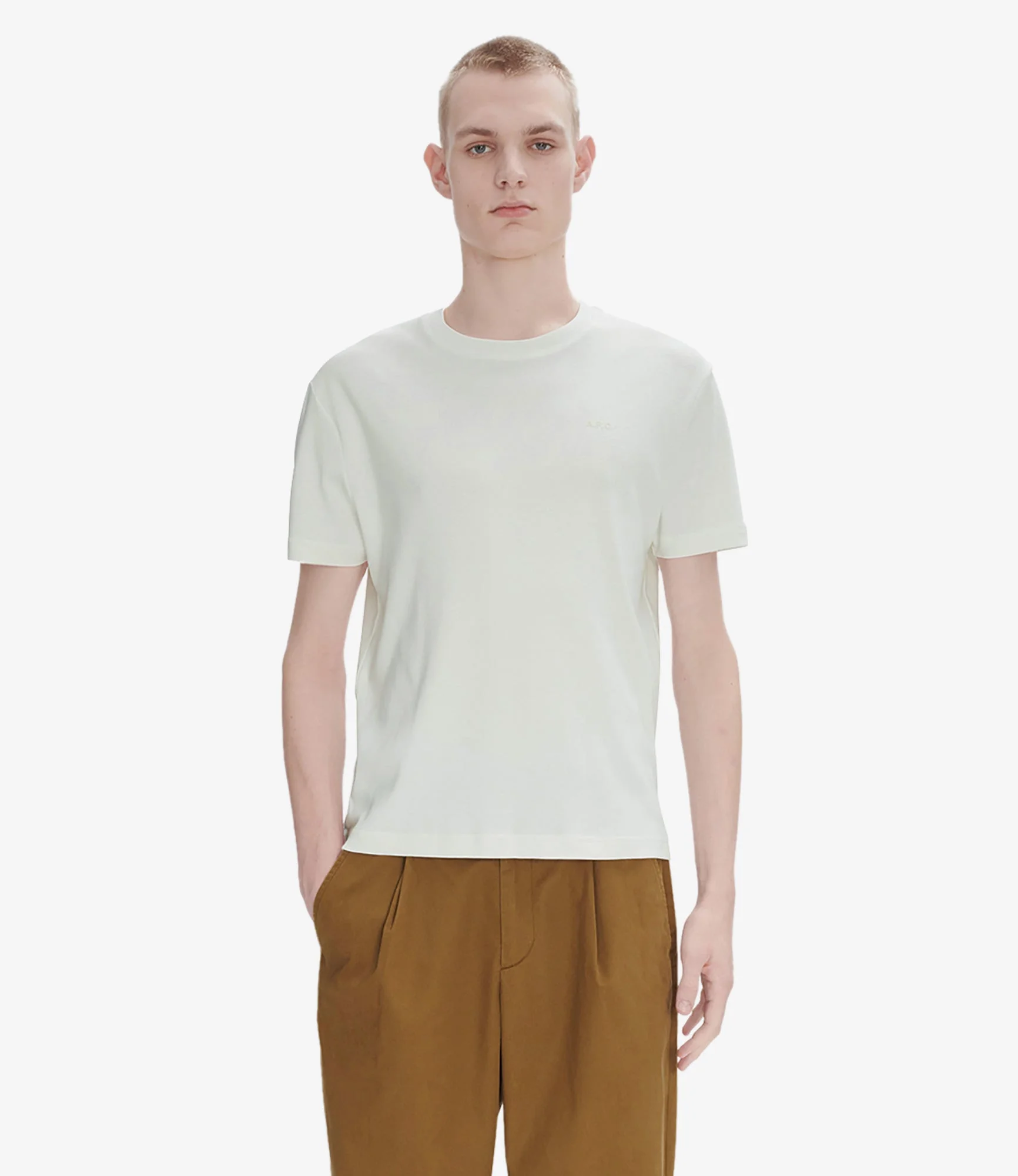 - Thick cotton (230 g). - Fitted cut. - Crew neckline. - Tone-on-tone raised A.P.C. logo over the heart. - 100% Cotton from organic farming. Size Advice - Tim is 6'2 tall and is wearing size M. Composition & Material - 100% cotton. - Portuguese material. - Made in Portugal. - Machine wash cold (86°F) inside-out.