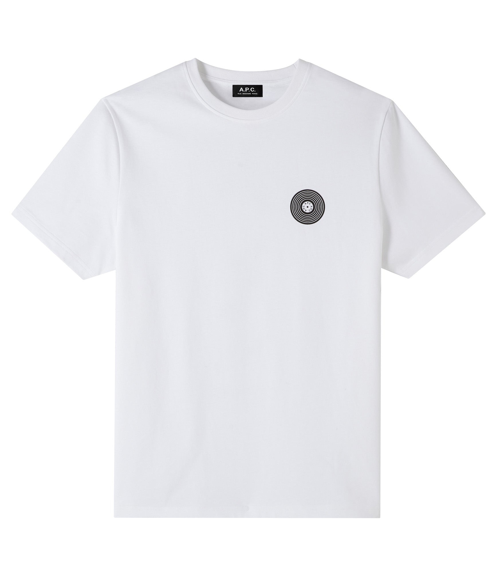 PRODUCT DETAILS -Thick cotton (230 g). -Straight cut. -Crew neckline. -Vinyl record motif with A.P.C. label printed over the heart. -Printed with diagram of Madison dance steps that form the letters A.P.C. -100% Cotton from organic farming. FABRIC & CARE - 100% Cotton. - Portuguese material. - Made in Portugal. - Machine wash (86°F), inside-out. SIZE - Hatim is 6'2" tall and is wearing size M. - This model fits true to size; choose your usual size.